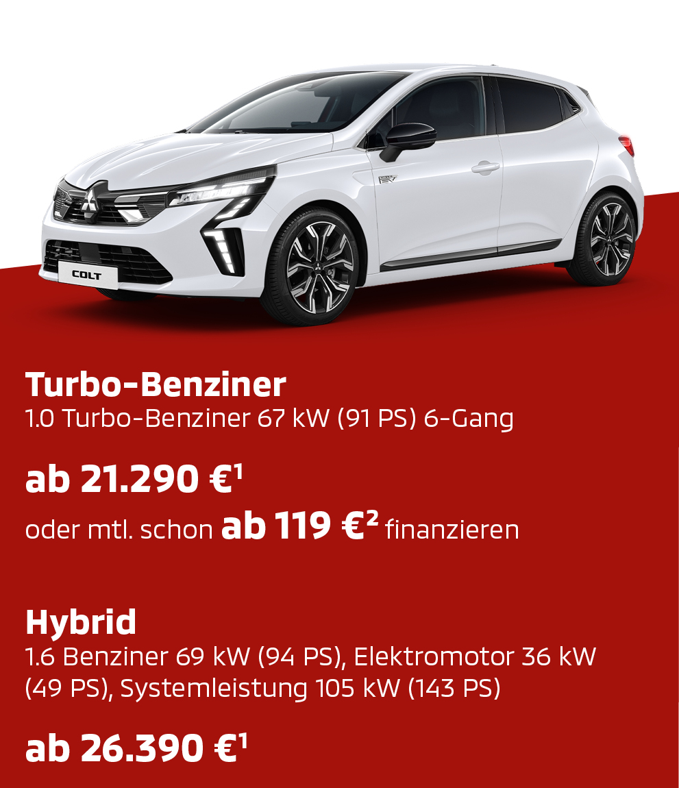 2 | COLT Edition 1.0 Turbo 67 kW (91 PS) 6-Gang Finanzierungsbeispiel (beispielhaftes Angebot, Stand: August 2025, Zinsänderungen bleiben vorbehalten): zugrunde liegender Fahrzeugpreis entspricht dem unverbindlich empfohlenen Preis der MMD Automobile GmbH, Friedberg, in Höhe von 21.290 € (dieser ergibt sich aus der unverbindlichen Preisempfehlung 22.790 € abzüglich 1.500 € unverbindl. empfohl. Aktions-Rabatt), Anzahlung 4.990,00 €, Nettodarlehensbetrag 16.300,00 €, Laufzeit 24 Monate, Sollzins (gebunden) 3,92 %, effektiver Jahreszins 3,99 %, 1. Monatsrate 118,83 €, 22 Monatsraten à 119,00 €, letzte Rate 14.780,00 €, Gesamtbetrag 22.506,83 €. Ein freibleibendes Angebot der MKG Bank, Zweigniederlassung der MCE Bank GmbH, Schieferstein 9, 65439 Flörsheim, zzgl. Überführungskosten. Repräsentative Kreditbeispiele: Die Angaben stellen zugleich das 2/3-Beispiel gem. § 6 a Abs. 4 PAngV dar.