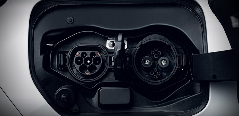 Der Eclipse Cross Plug-in Hybrid verfügt über zwei Ladeanschlüsse. Ein Typ-2-Anschluss (links) ermöglicht das Laden über ein Mode-3-Kabel an einer Ladestation / Wallbox oder über ein Mode-2-Kabel an einer Haushaltssteckdose. Ein CHAdeMO-Anschluss (rechts) ermöglicht zudem das Laden an einer Schnellladestation.