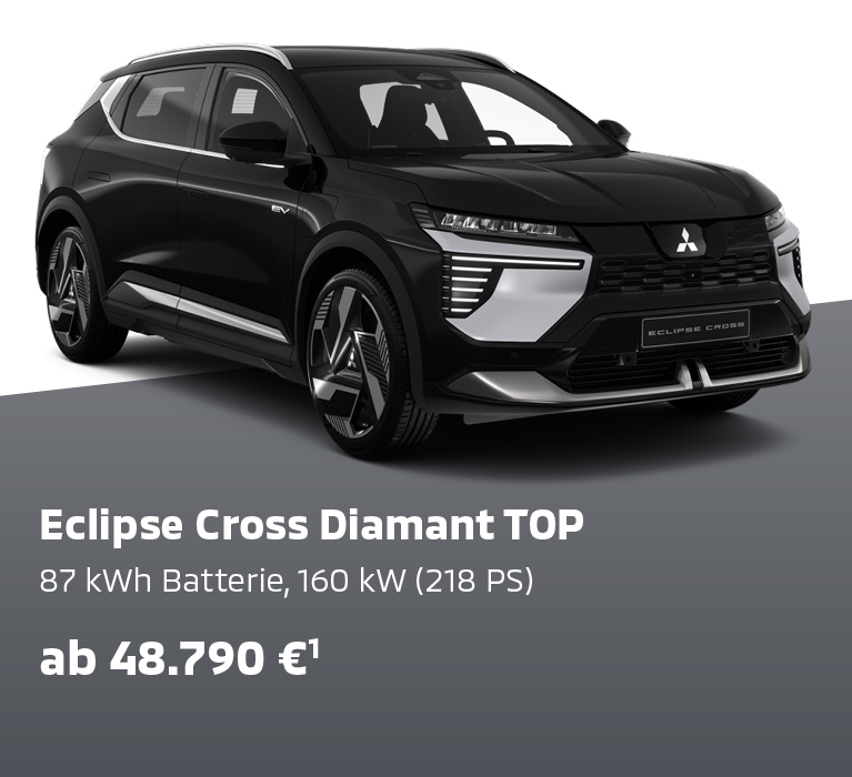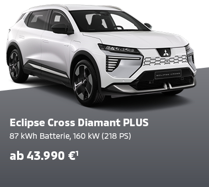 Eclipse Cross Diamant TOP, 160 kW (218 PS) Energieverbrauch 16,9 kWh/100 km Strom; CO2-Emission 0 g/km; CO2-Klasse A; Eclipse Cross Diamant TOP mit Luxury-Paket, 160 kW (218 PS) Energieverbrauch 17,1 kWh/100 km Strom; CO2-Emission 0 g/km; CO2-Klasse A; kombinierte Werte.**
